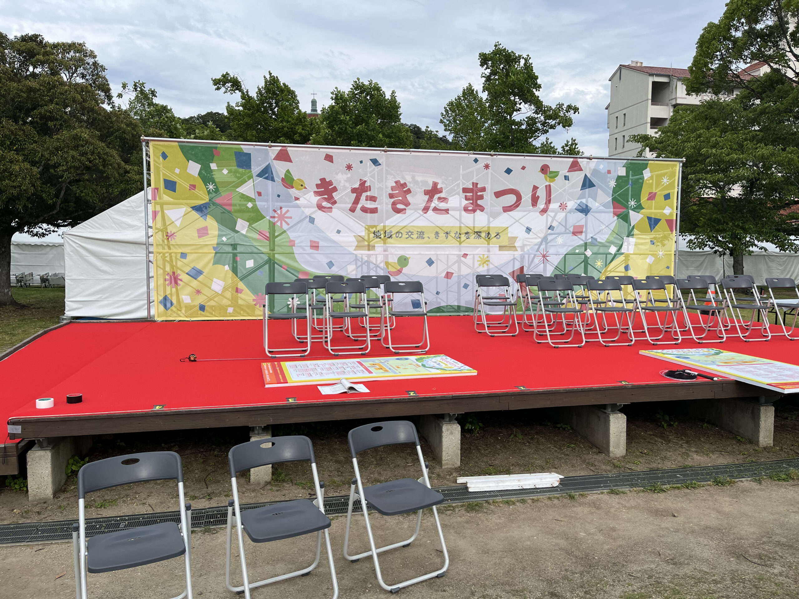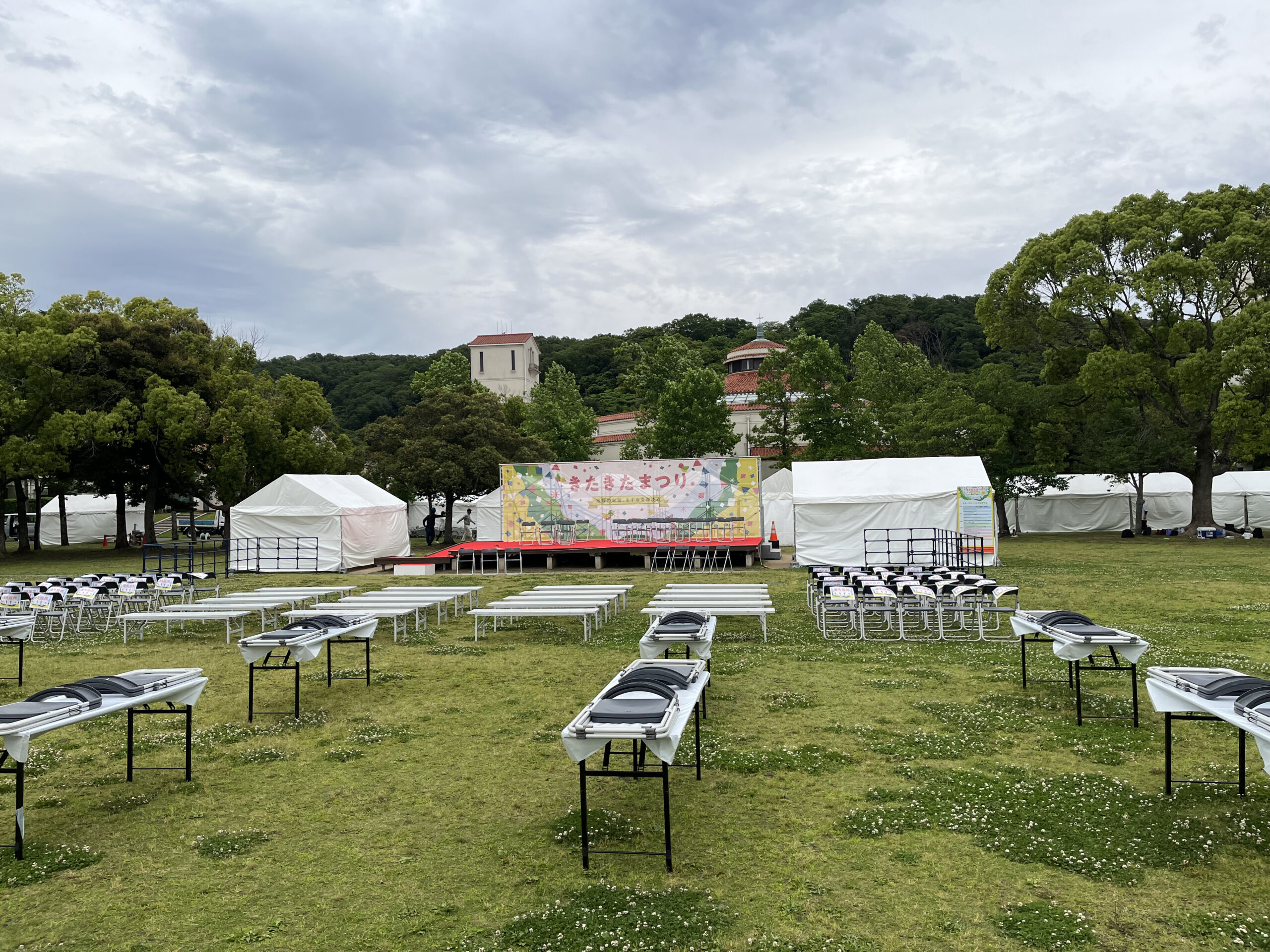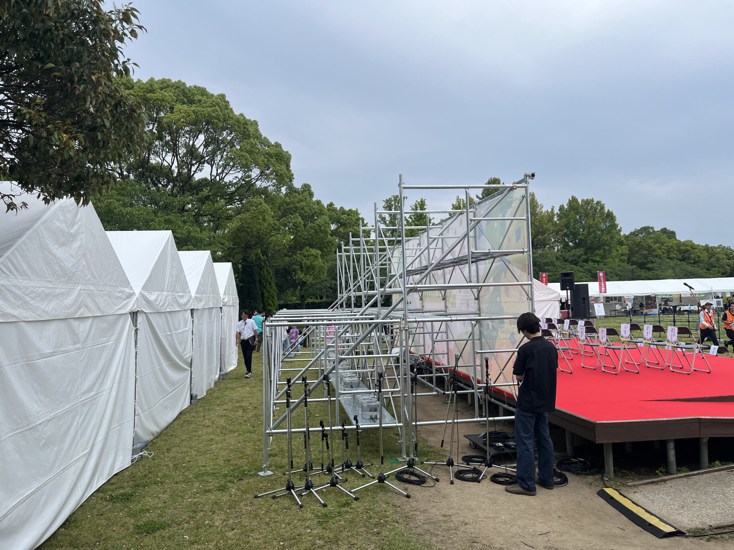 きたきたまつり 会場設営 2025.06.06設営・施工実績 神戸市北区のしあわせの村において、きたきたまつりの会場設営をさせていただきました。 ステージは既存のステージを利用する為、施工はありませんでしたが、 ステージバックのターポリンサインの施工はさせていただきました。 A2イントレ足場材を用いて転倒しないようしっかりと施工しております。 緑道と芝生広場内に多数のパイプテントの設営をしております。 発電機の手配や音響設備+オペレーターの手配、各種看板の製作・取付までしております。 イベント会場設営はBASEへ!!! Tweet Share Hatena Pocket RSS 投稿者: 島田 設営・施工実績 合同インターンシップ説明会 会場設営 ヴィッセル神戸 就職説明会 会場設営 関連記事一覧 ロート製薬様竣工式 神戸まつり 会場設営 小学校 運動会テント設営 秋華祭 会場設営 お笑いライブ 会場設営 肉フェス トラスアーチ設営 あざみ祭 会場設営 神戸みなとHANABI ダブルフェンスレンタル ふれあい中央カーニバル会場設営