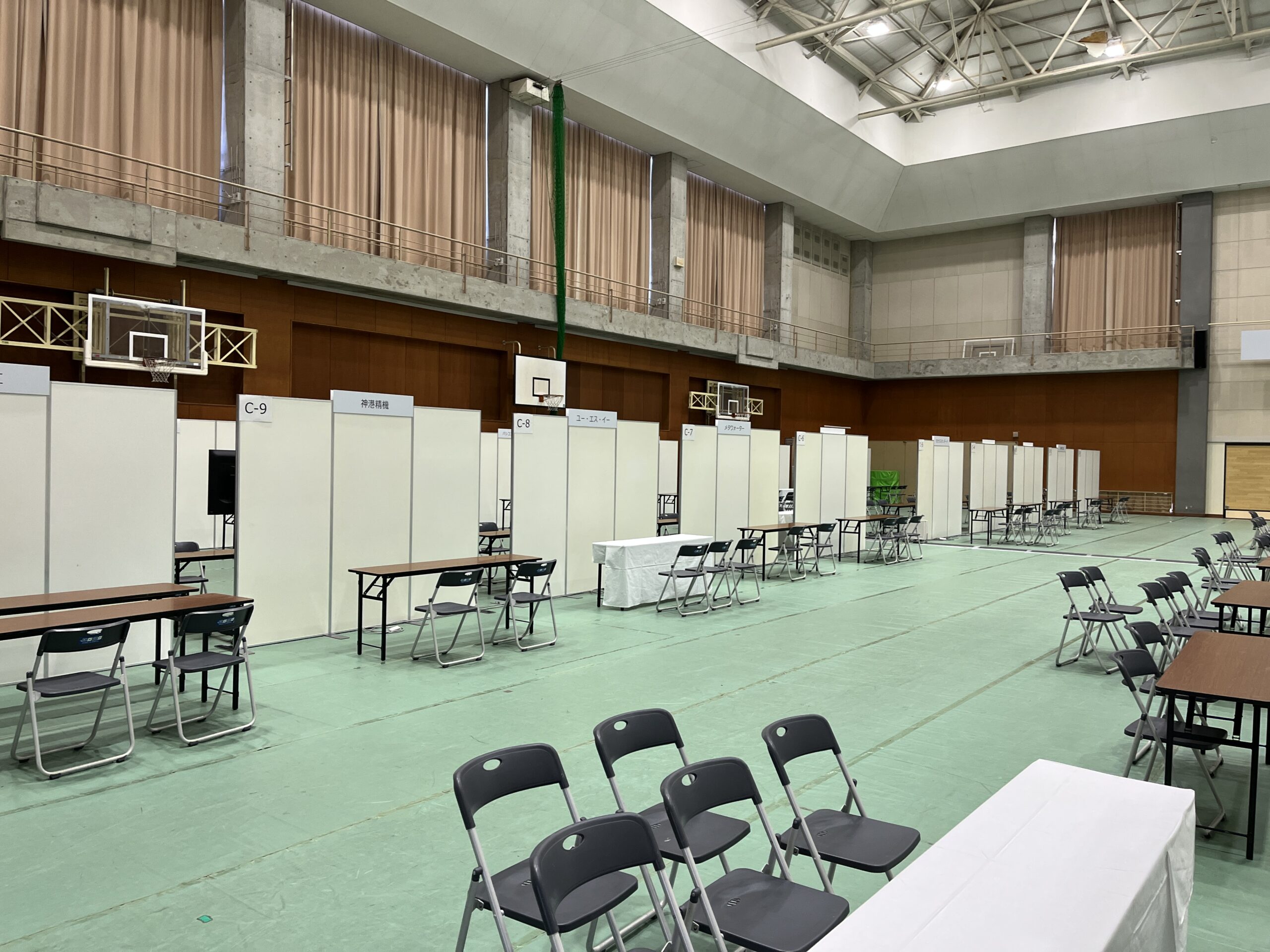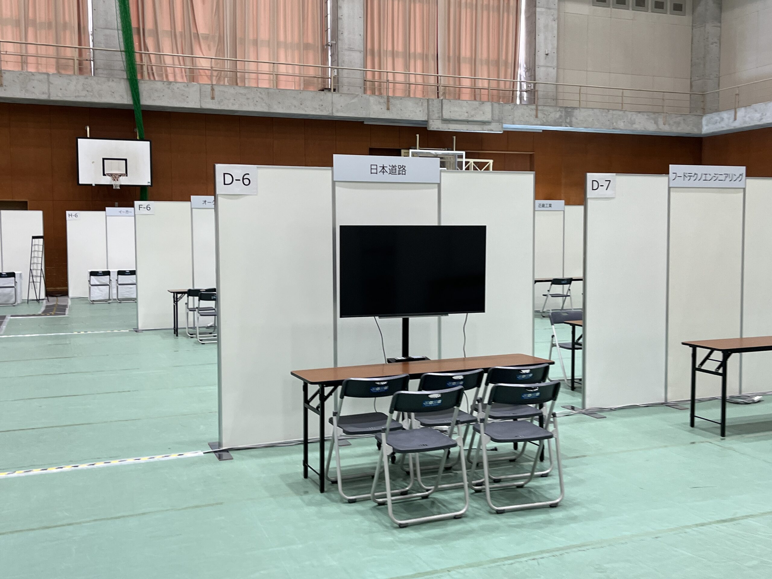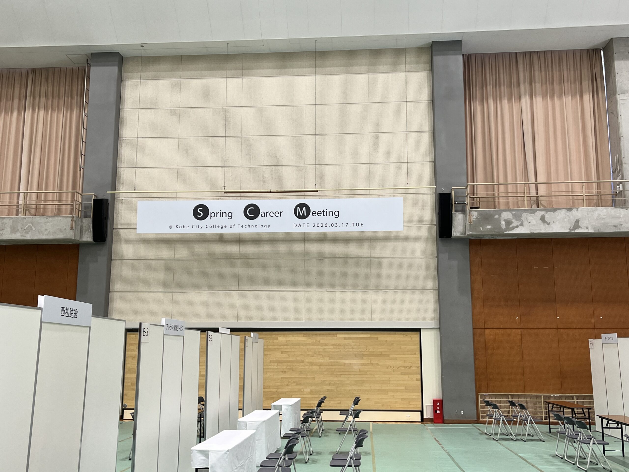 Spring Career Meeting 会場設営 2026.03.16設営・施工実績 神戸市立神戸工業高等専門学校におい開催された、Spring Career Meetingの会場設営をさせていただきました。 フロアシートの敷き込み、EZパネルによる各ブースの施工をしております。 各ブースにはテーブルイス電源社名板などの基本備品に加えモニターやカタログスタンドなどのオプション備品にレンタルもしております。 電気工事については、発電機の手配をしております。 その他、立看板や横一文字看板の製作・取付もさせていただきます。 就職イベントの設営はBASEへ!!! Tweet Share Hatena Pocket RSS 投稿者: 島田 設営・施工実績 伏見酒フェス 会場設営 客船フェスタ2026 関連記事一覧 夕涼みの会 会場設営 阪神淡路大震災1.17のつどい 下水道展’25大阪 ブース施工 PiTaPa20周年記念式典 会場設営 玉津大久保線現地調査用パイプテント設営 神戸市長田区 お弁当屋さん看板施工をさせて頂きました 神戸北野パリウィーク2024 会場設営 兵庫知事選にかかる開票所 会場設営 神戸医療産業都市 一般公開 会場設営